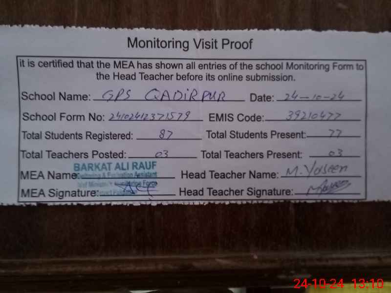 | EMIS Code: 39210477 | Name of School: GPS QADIR PUR | |||