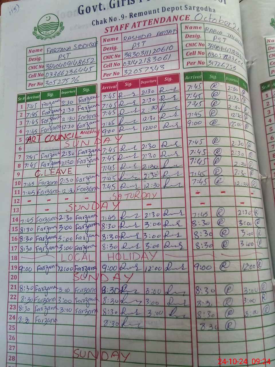 | CNIC | Full Name | Designation | R/C | Absence during last cal. month |