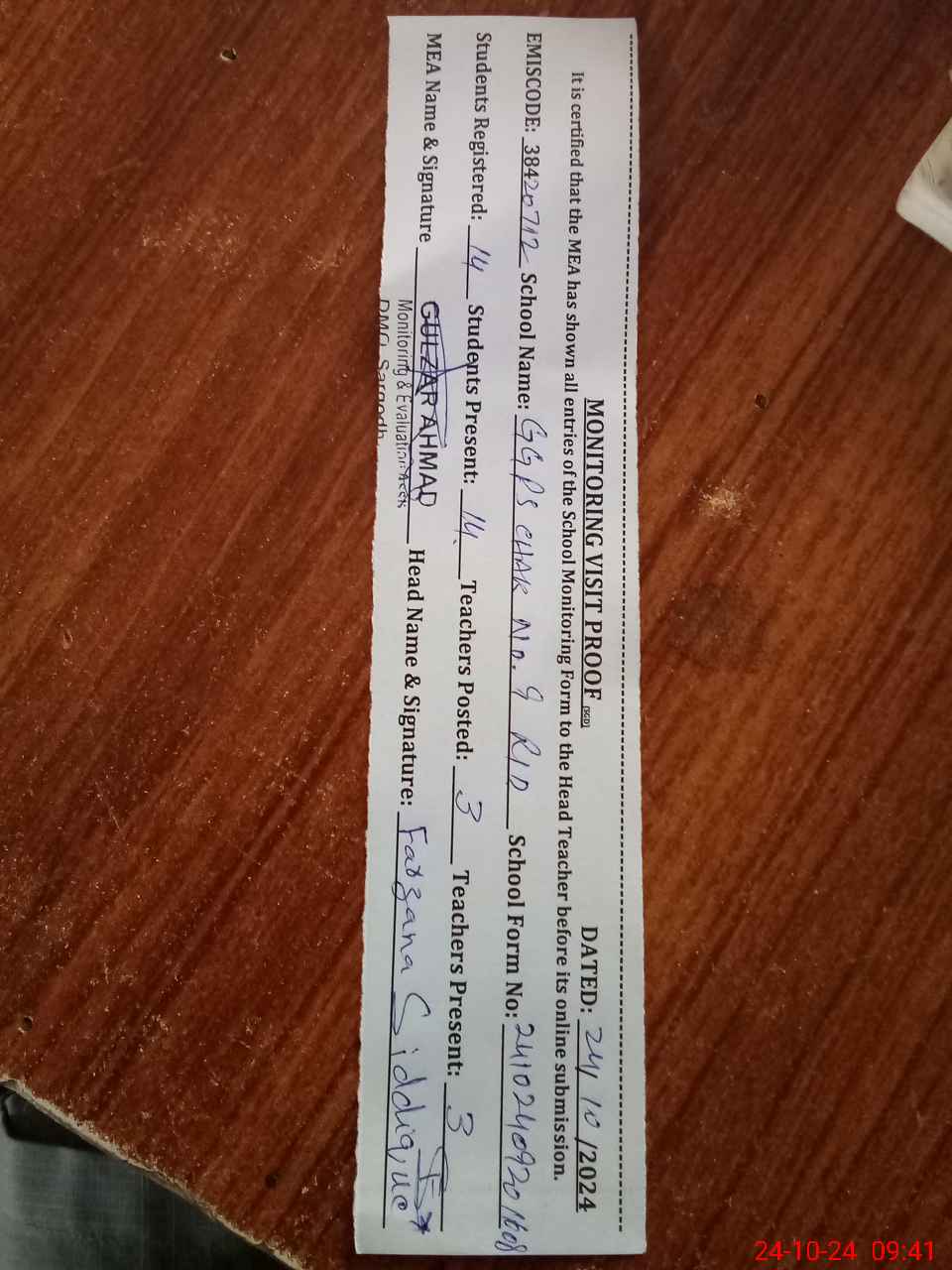 | EMIS Code: 38420712 | Name of School: GGPS CHAK NO.9 REMOUNT DEPOT | |||