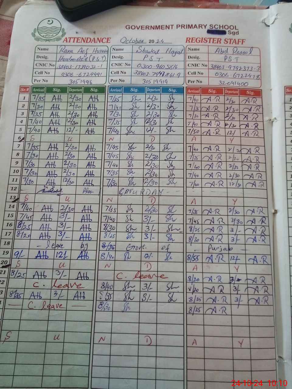 | CNIC | Full Name | Designation | R/C | Absence During Last Calender Month |