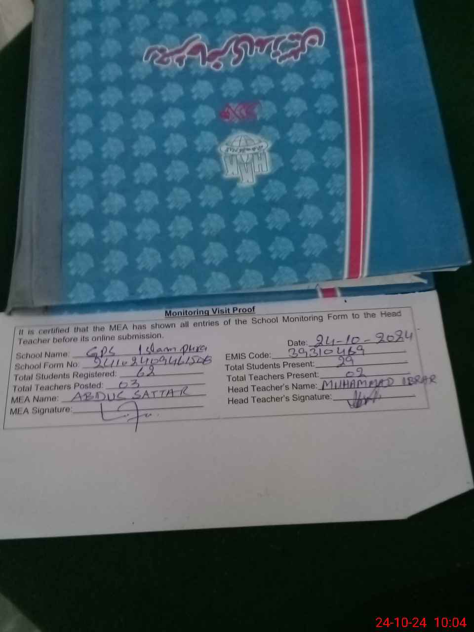 | Attendance Register | Head Teacher | MEA with School | Visit Proof |