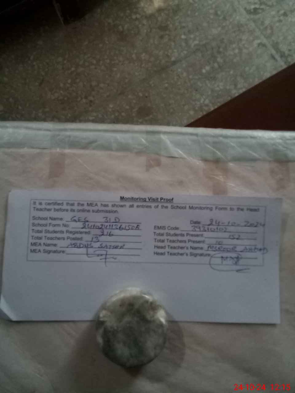 | Attendance Register | Head Teacher | MEA with School | Visit Proof |