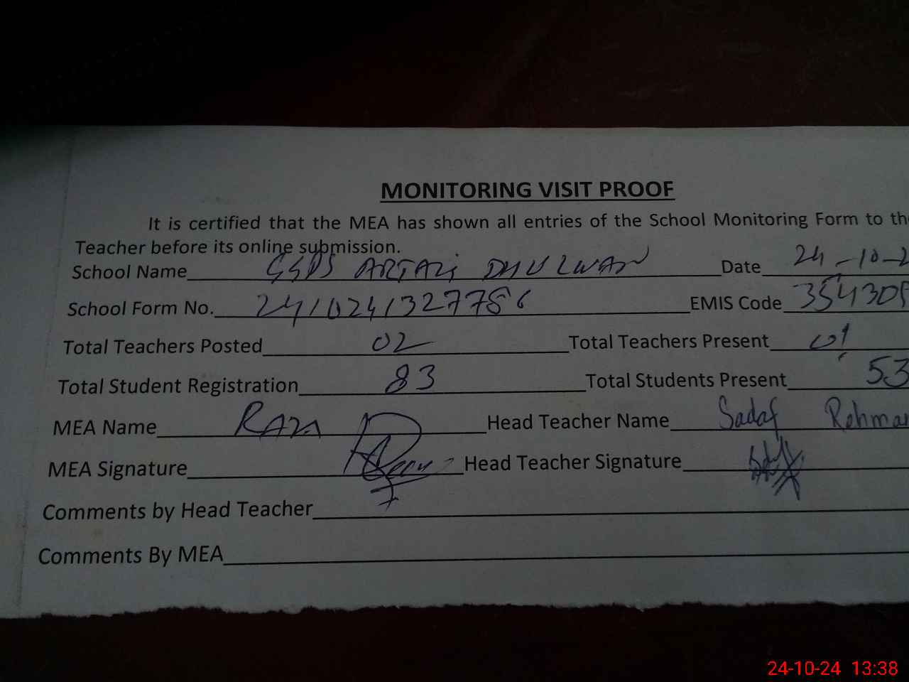 | Attendance Register | Head Teacher | MEA with School | Visit Proof |