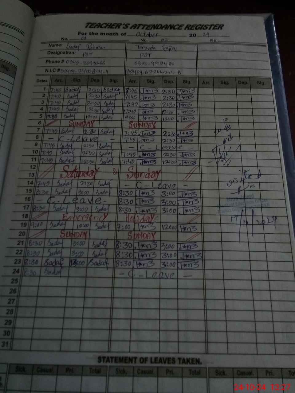 | CNIC | Full Name | Designation | R/C | Absence During Last Calender Month |