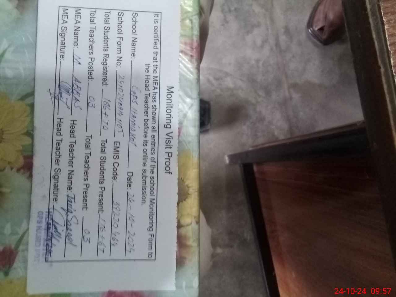 | Certified that this School was Inspected by the Undersigned MEA/DMO Today and the Information Stated Above is as Per Record. | |||||