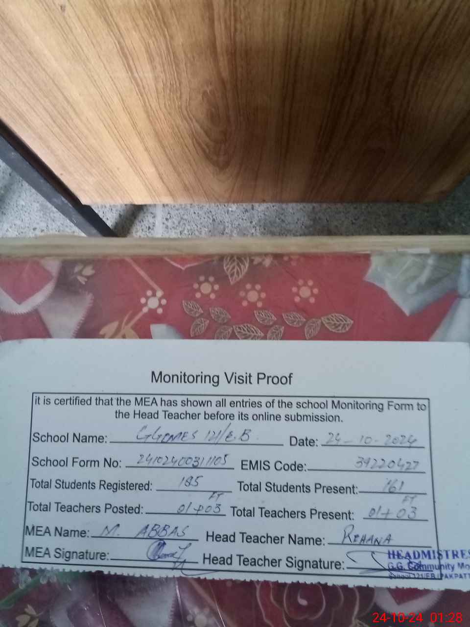 | Certified that this School was Inspected by the Undersigned MEA/DMO Today and the Information Stated Above is as Per Record. | |||||