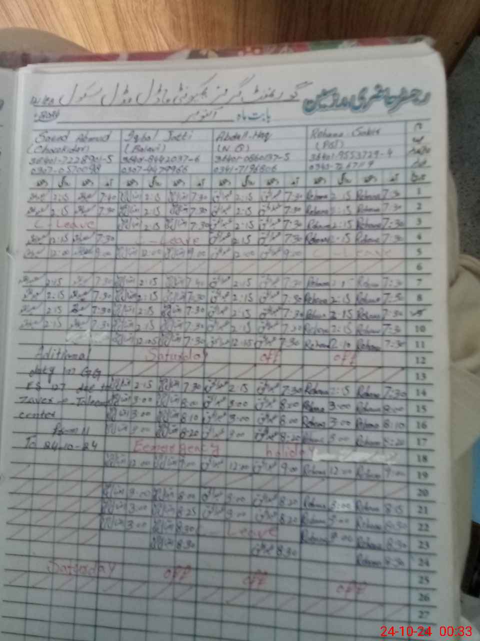 | Leave | Duty | Absent | Maternity | Medical | Ex- Pak |