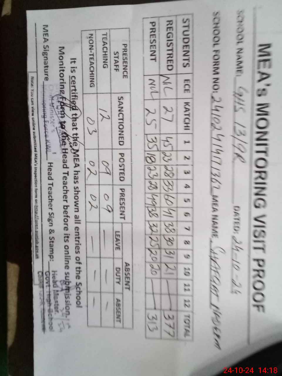 | Attendance Register | Head Teacher | MEA with School | Visit Proof |