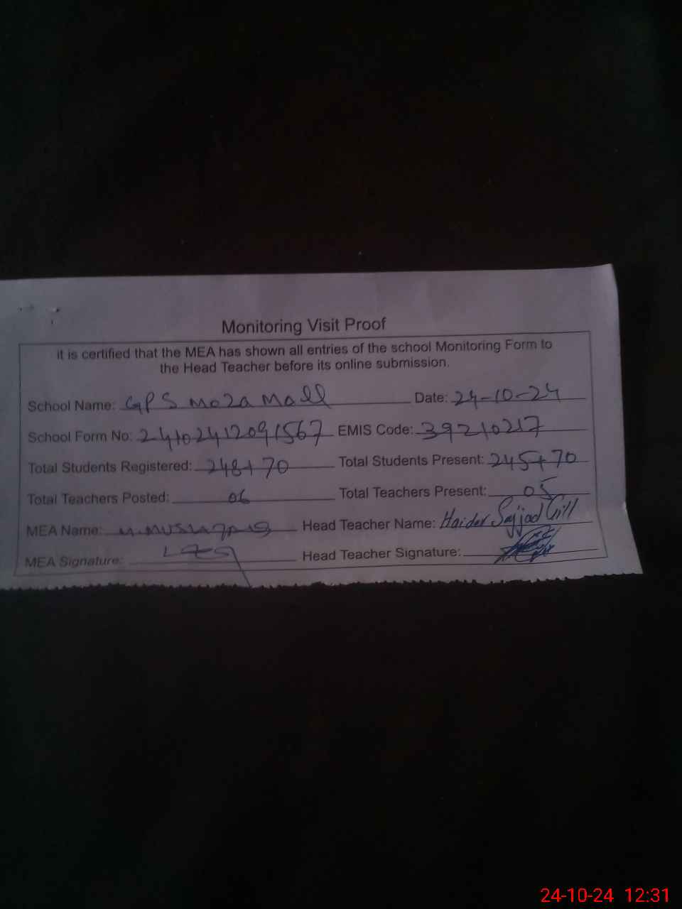 | Attendance Register | Head Teacher | MEA with School | Visit Proof |