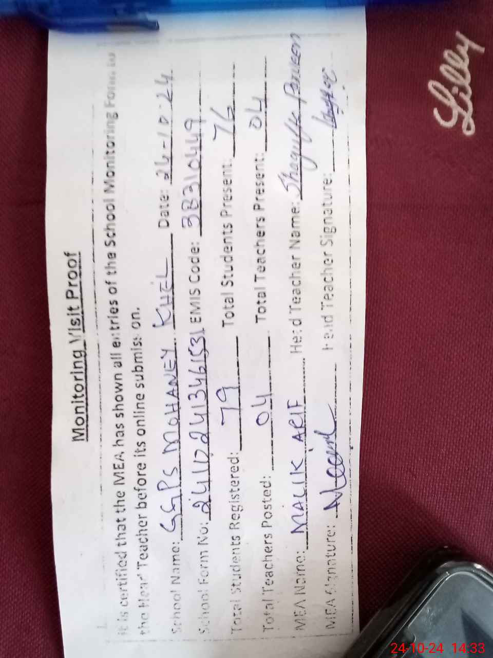 | Attendance Register | Head Teacher | MEA with School | Visit Proof |