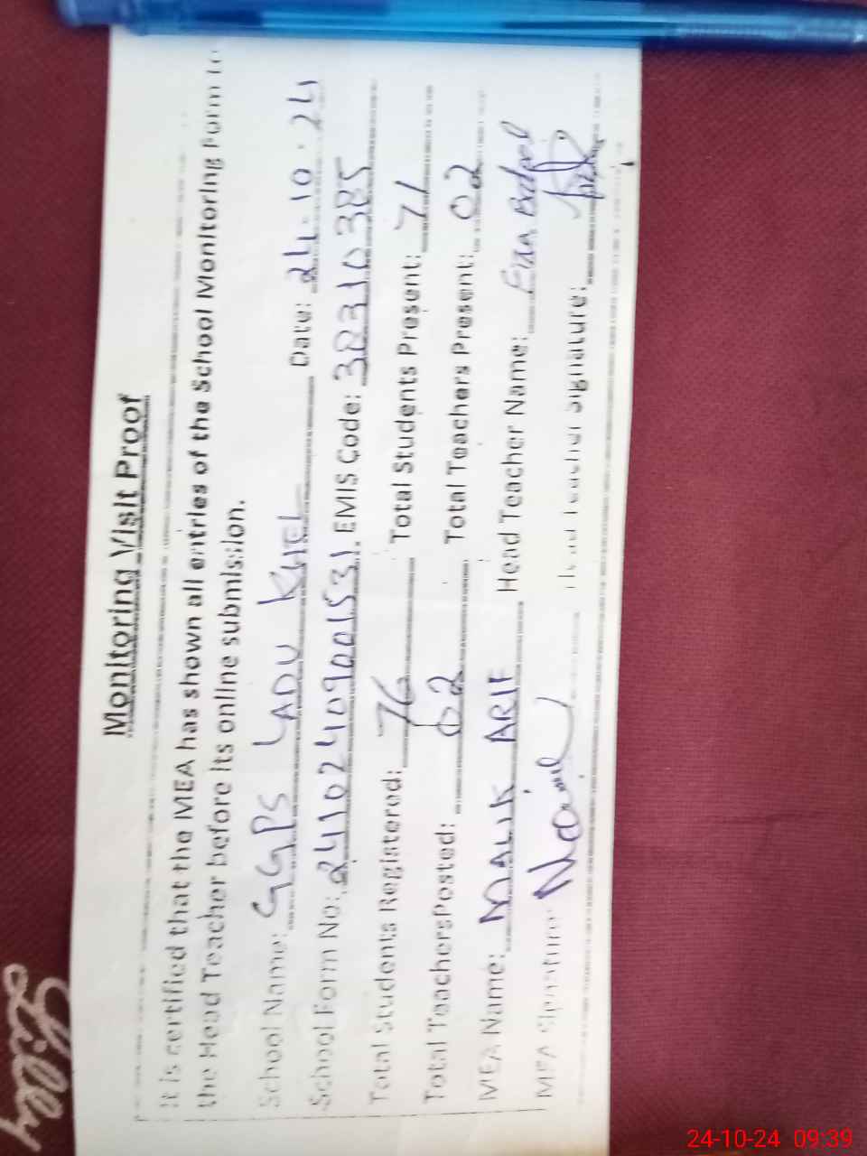 | Attendance Register | Head Teacher | MEA with School | Visit Proof |