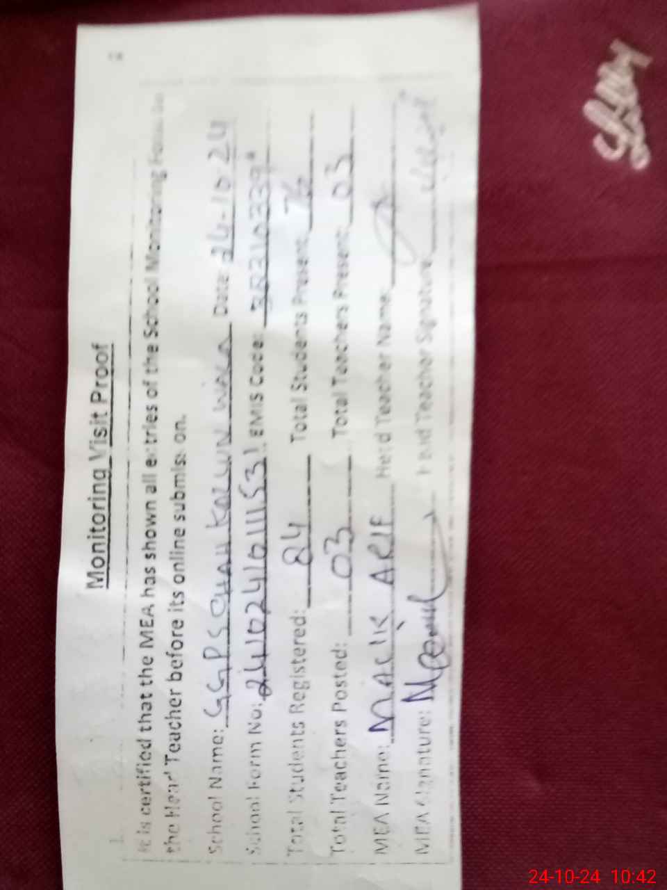 | Attendance Register | Head Teacher | MEA with School | Visit Proof |