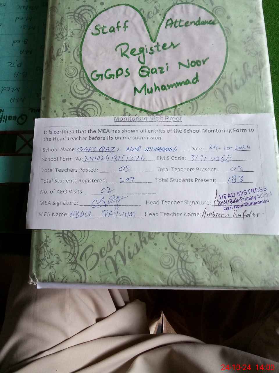 | Attendance Register | Head Teacher | MEA with School | Visit Proof |