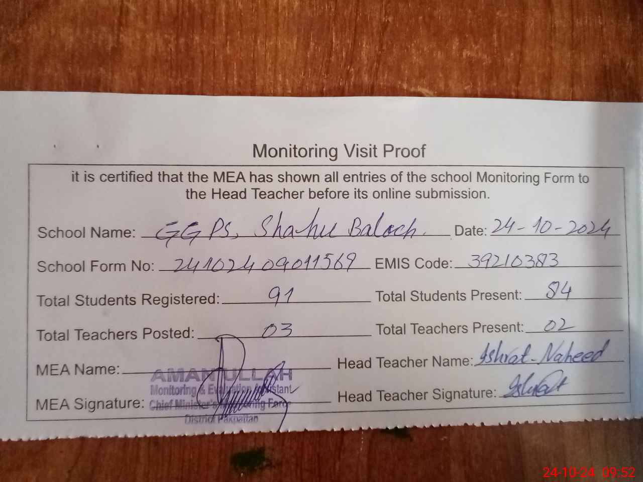 | Monitoring Date: 24-10-2024 | Start Time: 24-10-2024 09:01 AM | End Time: 24-10-2024 09:54 AM | Name of MEA: AM**** UL**** | |