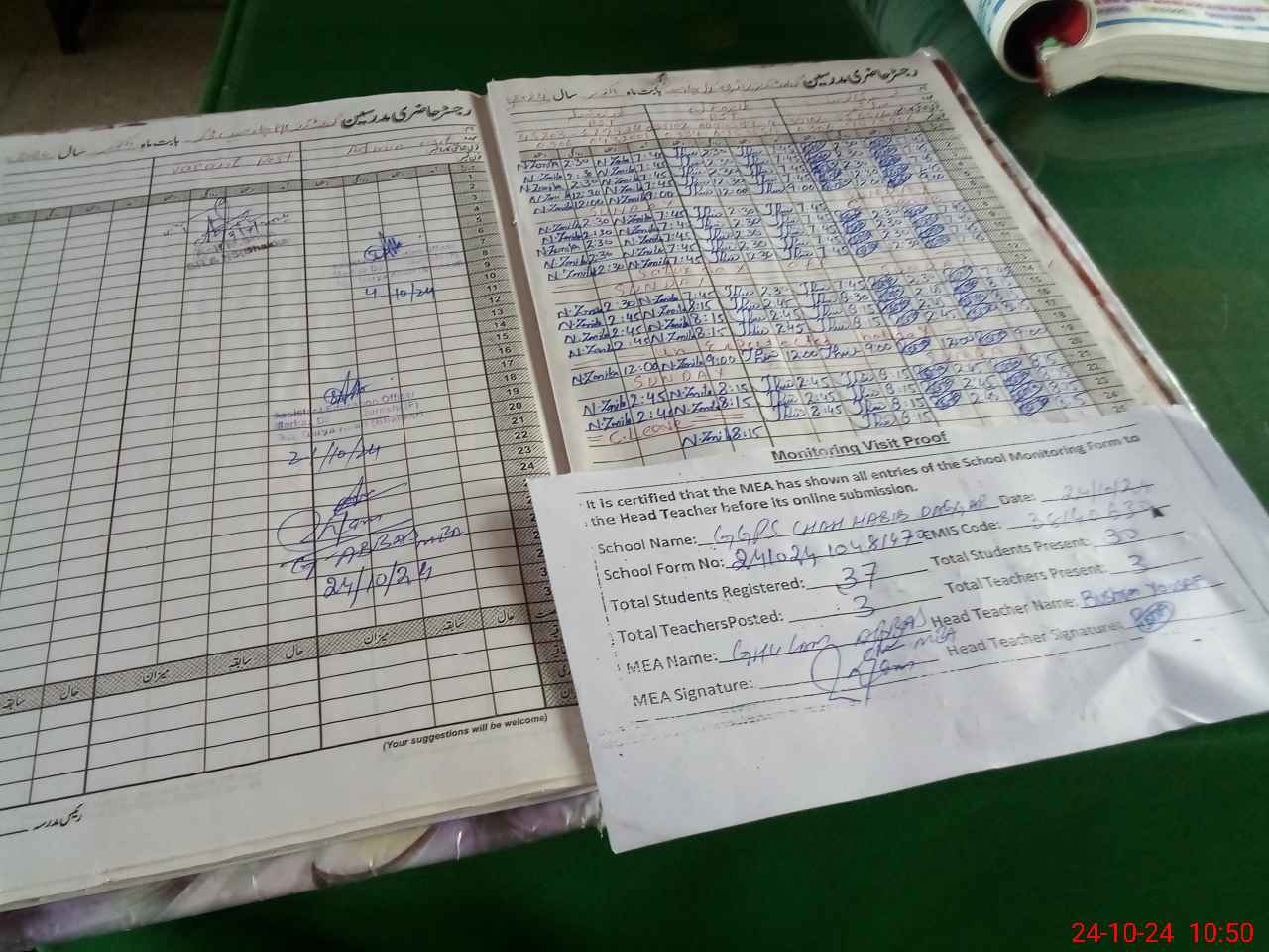 | Attendance Register | Head Teacher | MEA with School | Visit Proof |