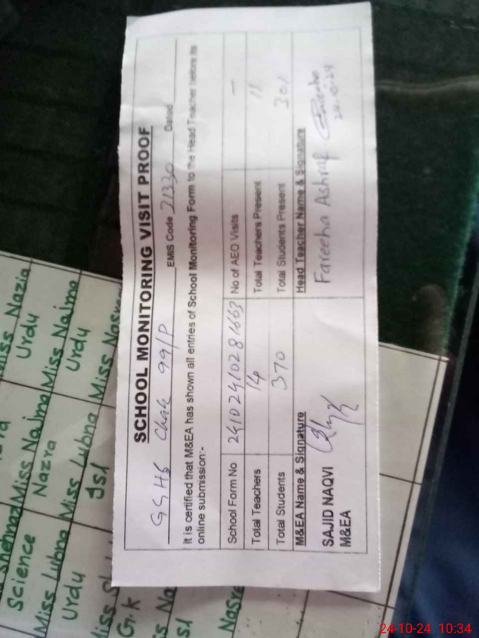 | Attendance Register | Head Teacher | MEA with School | Visit Proof |