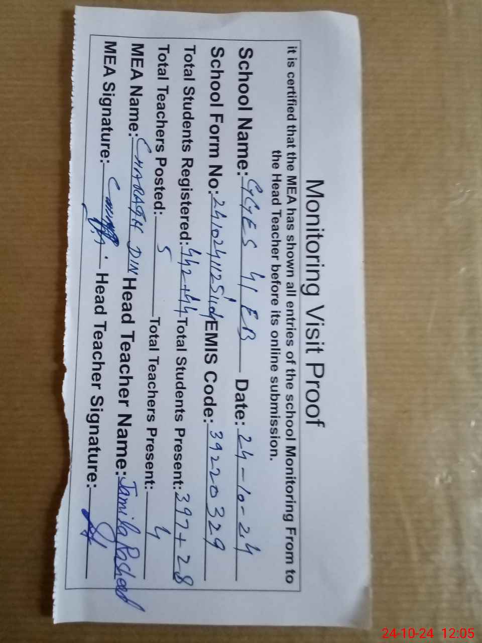 | Attendance Register | Head Teacher | MEA with School | Visit Proof |