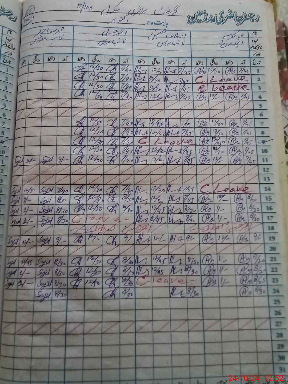 | CNIC | Full Name | Designation | R/C | Absence During Last Calender Month |