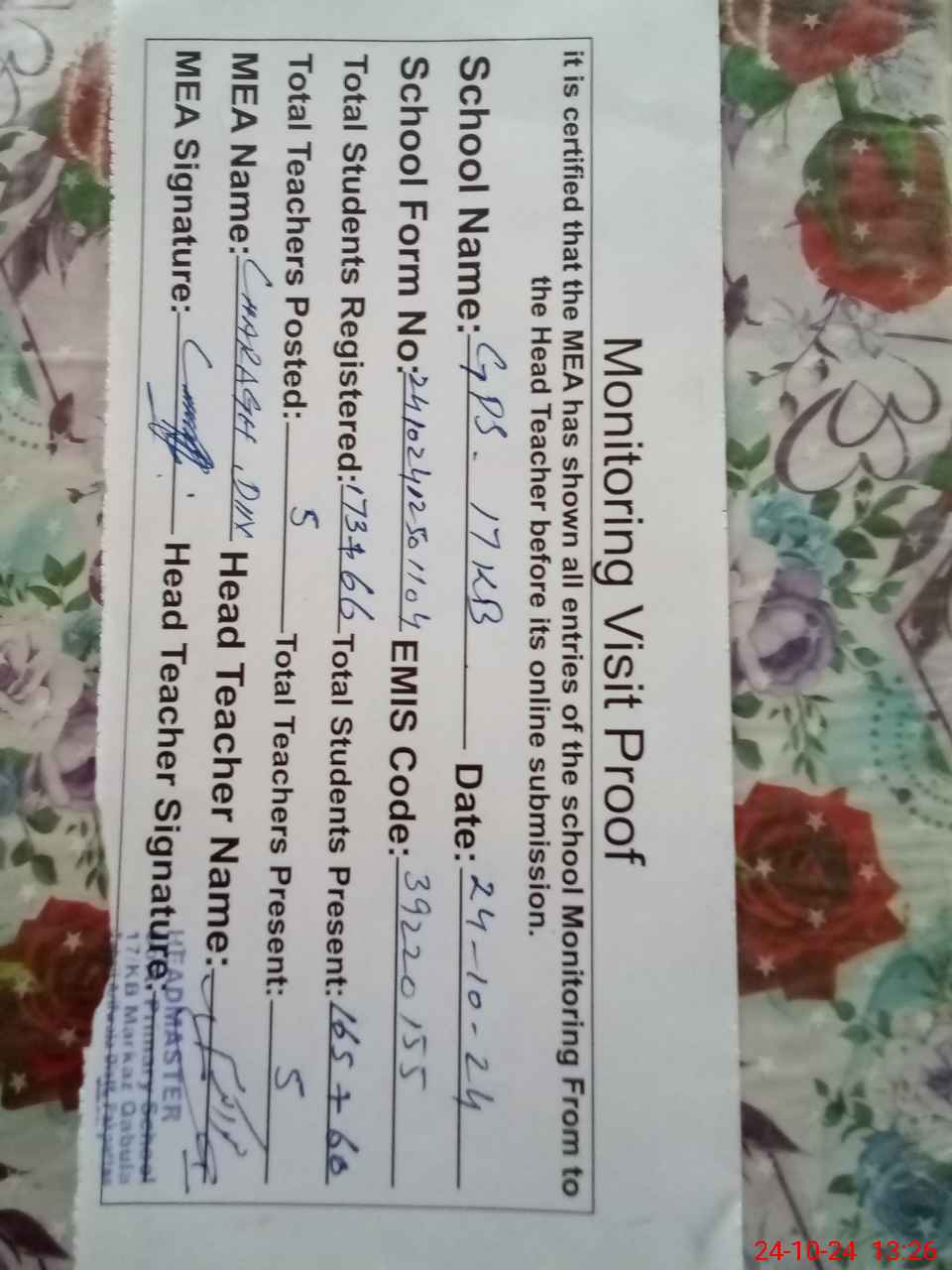| Attendance Register | Head Teacher | MEA with School | Visit Proof |