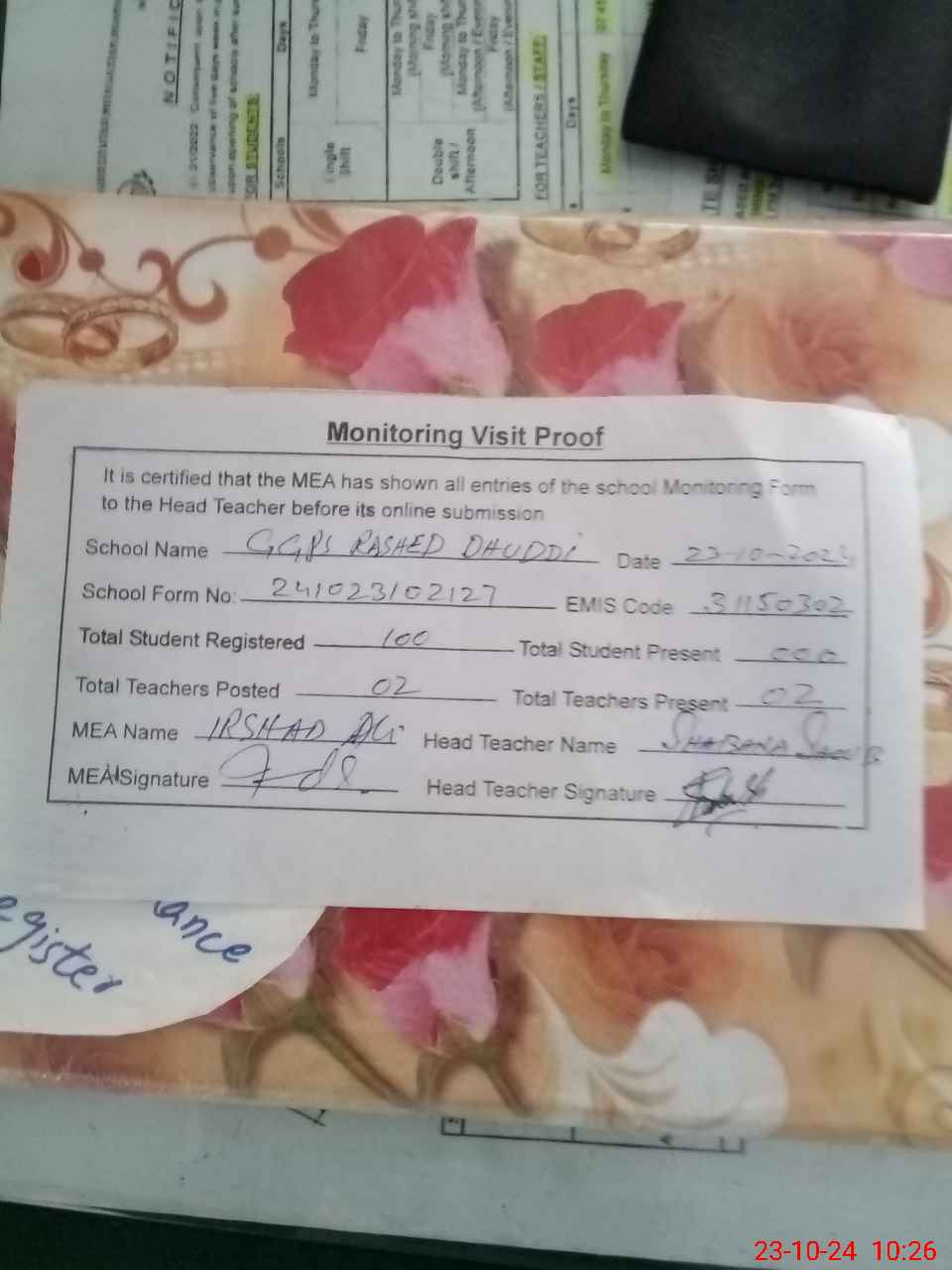| Attendance Register | Head Teacher | MEA with School | Visit Proof |