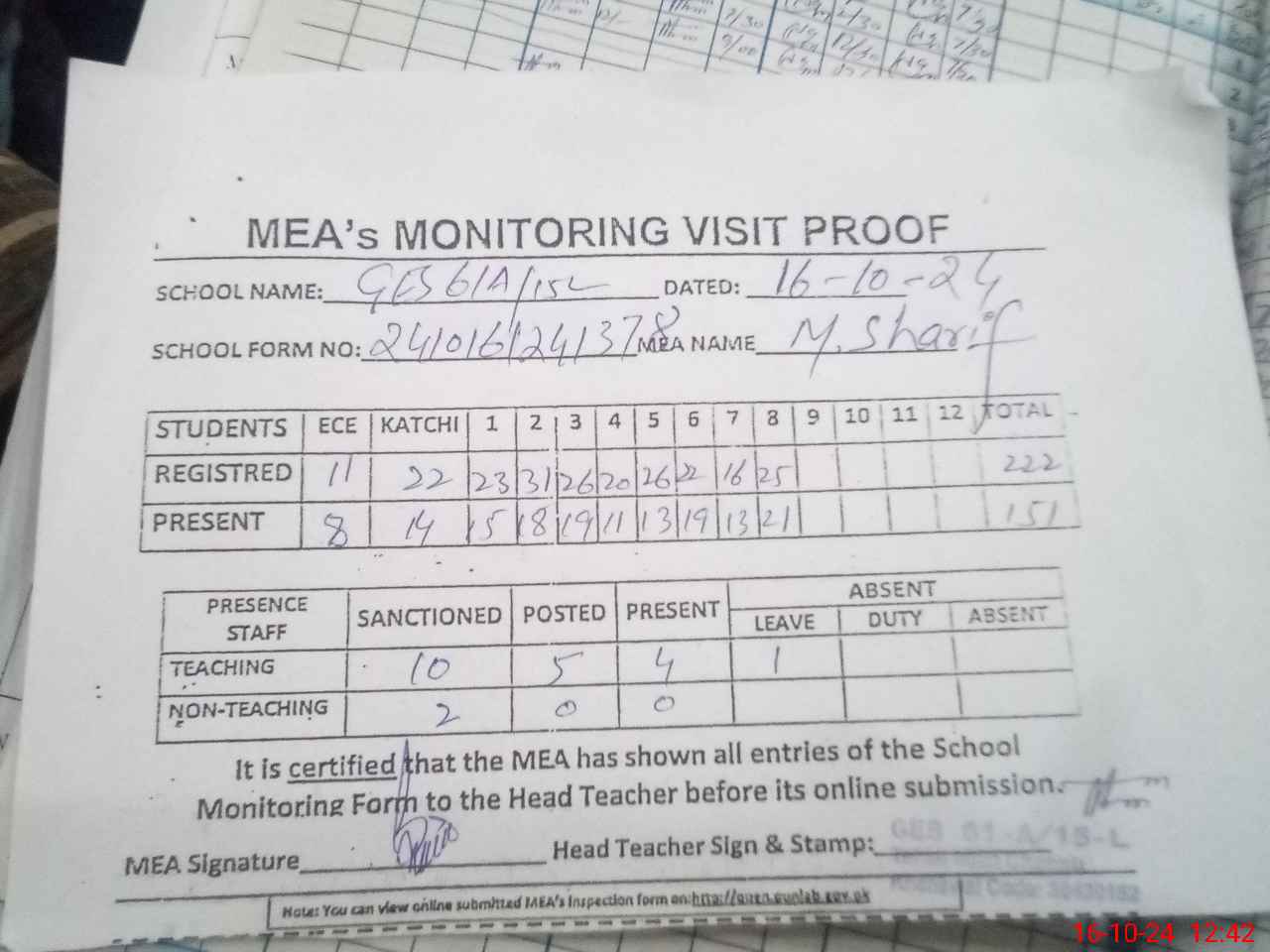 | Attendance Register | Head Teacher | MEA with School | Visit Proof |