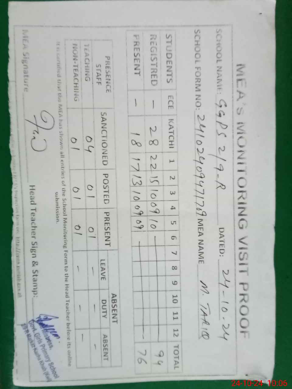 | Attendance Register | Head Teacher | MEA with School | Visit Proof |