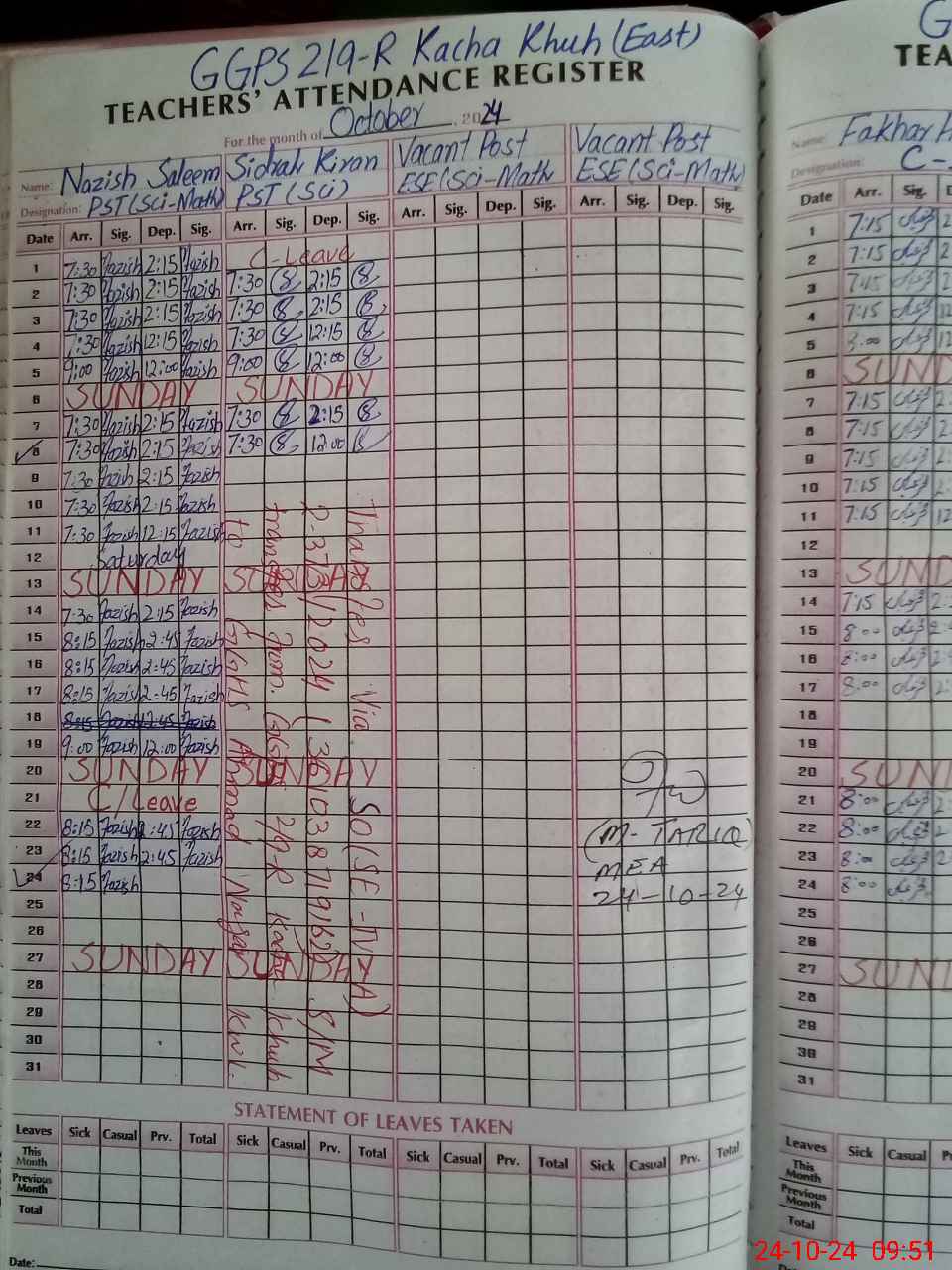 | CNIC | Full Name | Designation | R/C | Absence During Last Calender Month |