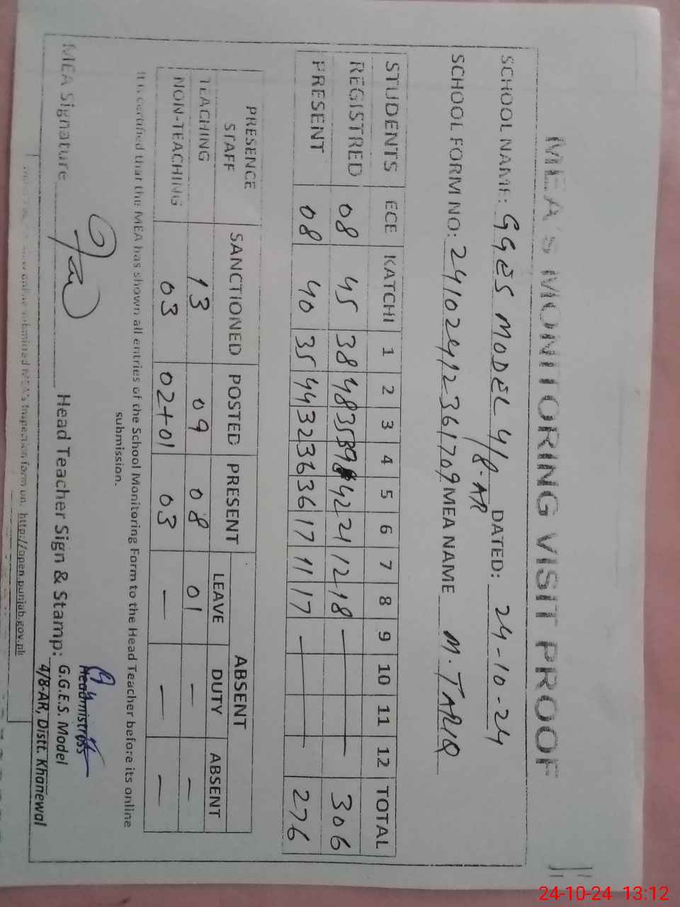 | Certified that this School was Inspected by the Undersigned MEA/DMO Today and the Information Stated Above is as Per Record. | |||||