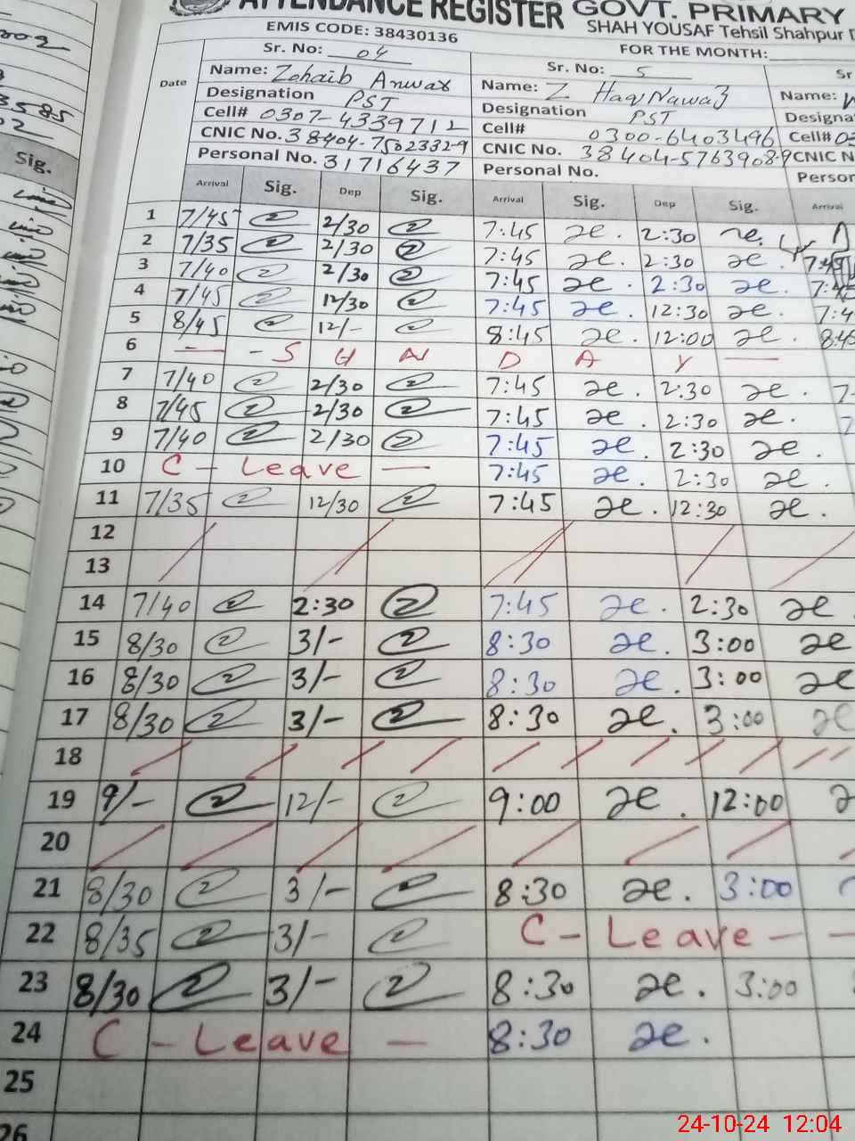 | CNIC | Full Name | Designation | R/C | Absence during last cal. month |