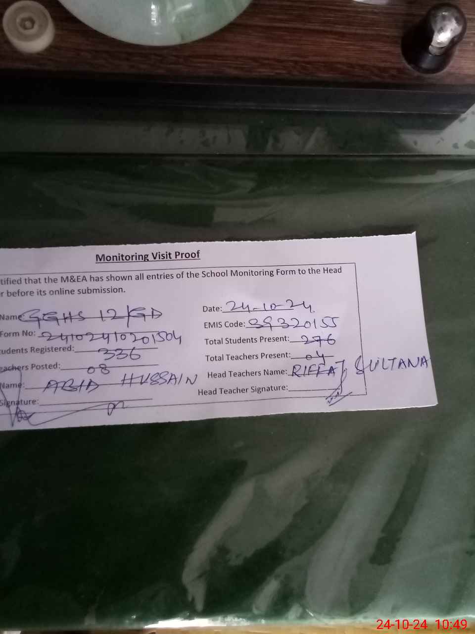 | Certified that this School was Inspected by the Undersigned MEA/DMO Today and the Information Stated Above is as Per Record. | |||||