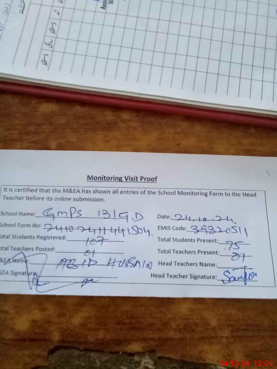 | Attendance Register | Head Teacher | MEA with School | Visit Proof |