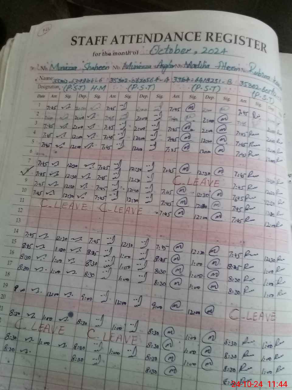 | CNIC | Full Name | Designation | R/C | Absence During Last Calender Month |