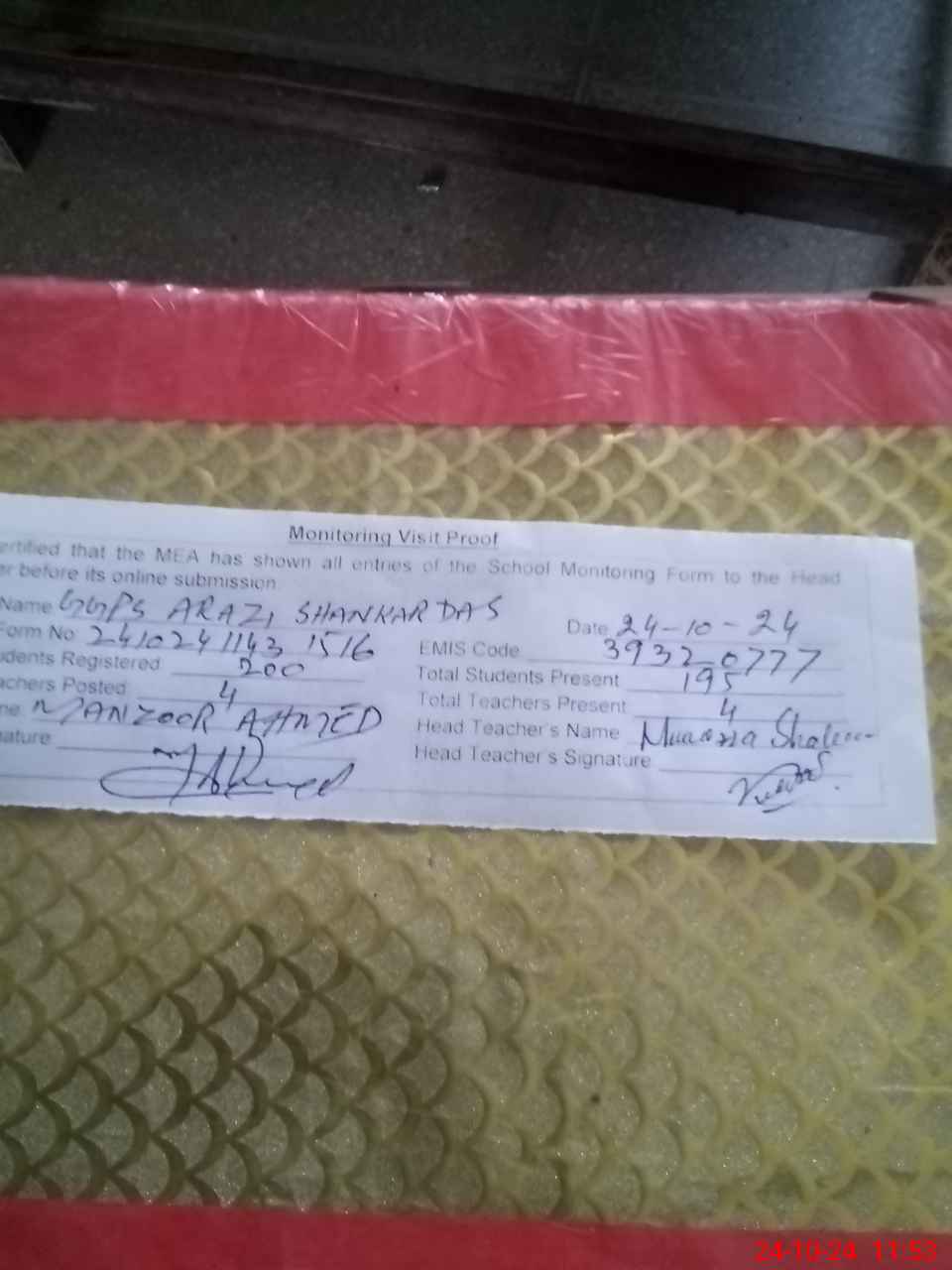 | Attendance Register | Head Teacher | MEA with School | Visit Proof |