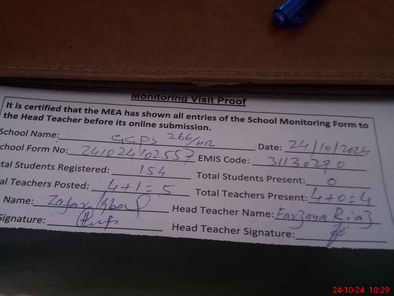 | Attendance Register | Head Teacher | MEA with School | Visit Proof |