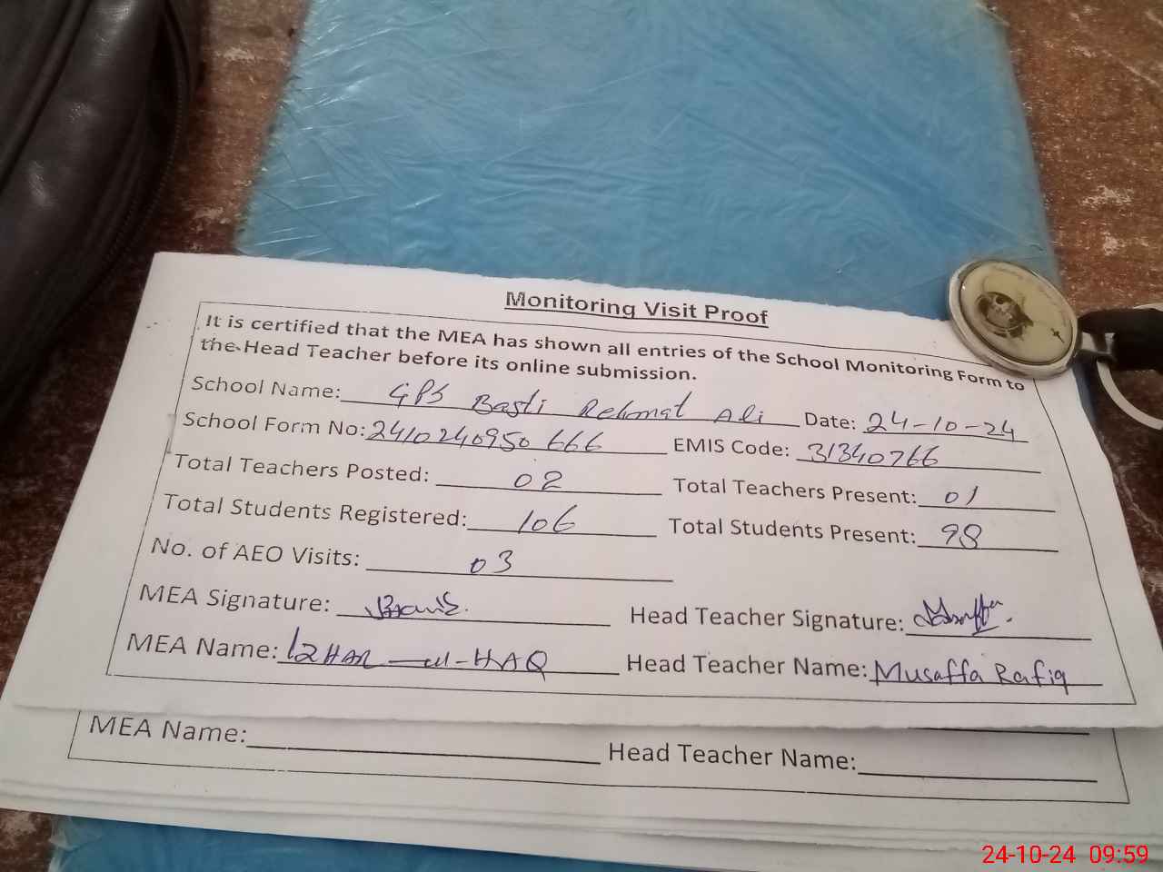 | Monitoring Date: 24-10-2024 | Start Time: 24-10-2024 09:31 AM | End Time: 24-10-2024 09:59 AM | Name of MEA: Mu**** Iz**** UlHa**** | |