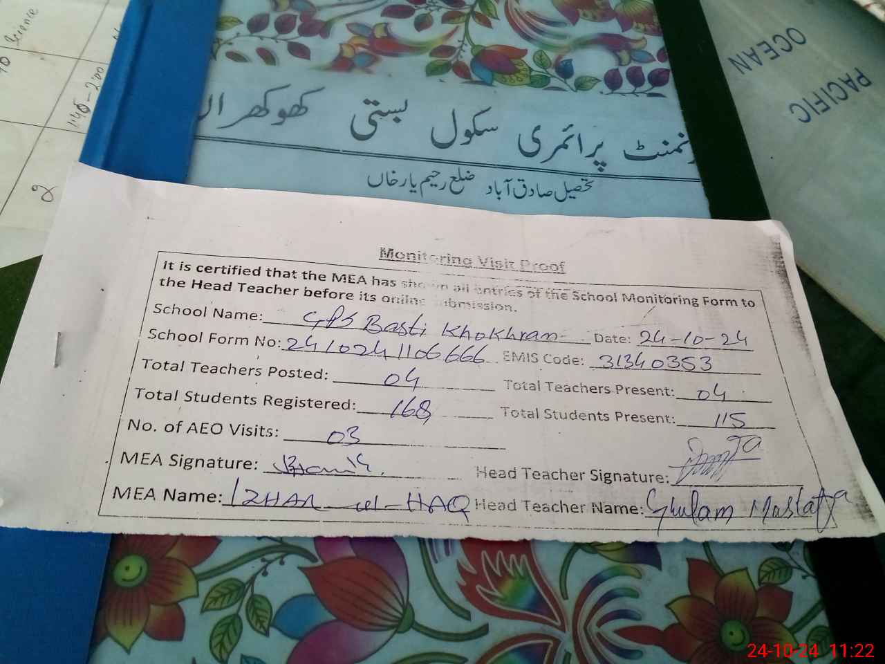 | Attendance Register | Head Teacher | MEA with School | Visit Proof |