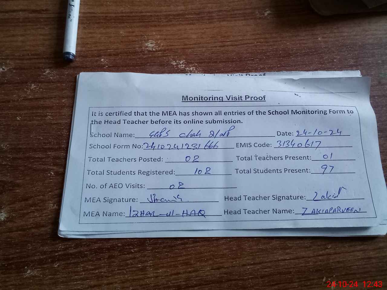 | Monitoring Date: 24-10-2024 | Start Time: 24-10-2024 12:09 PM | End Time: 24-10-2024 12:43 PM | Name of MEA: Mu**** Iz**** UlHa**** | |