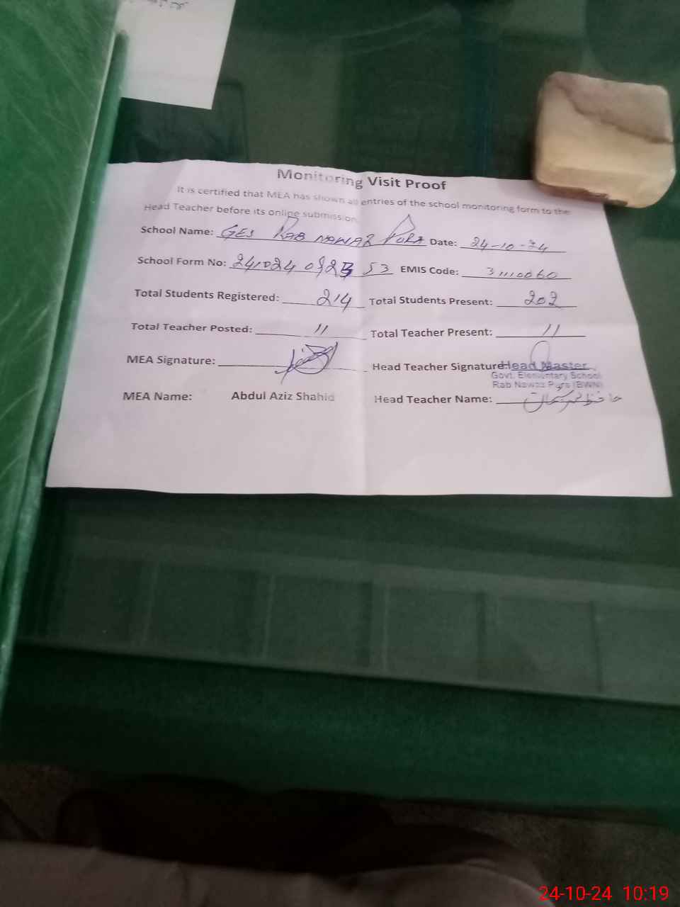 | Attendance Register | Head Teacher | MEA with School | Visit Proof |
