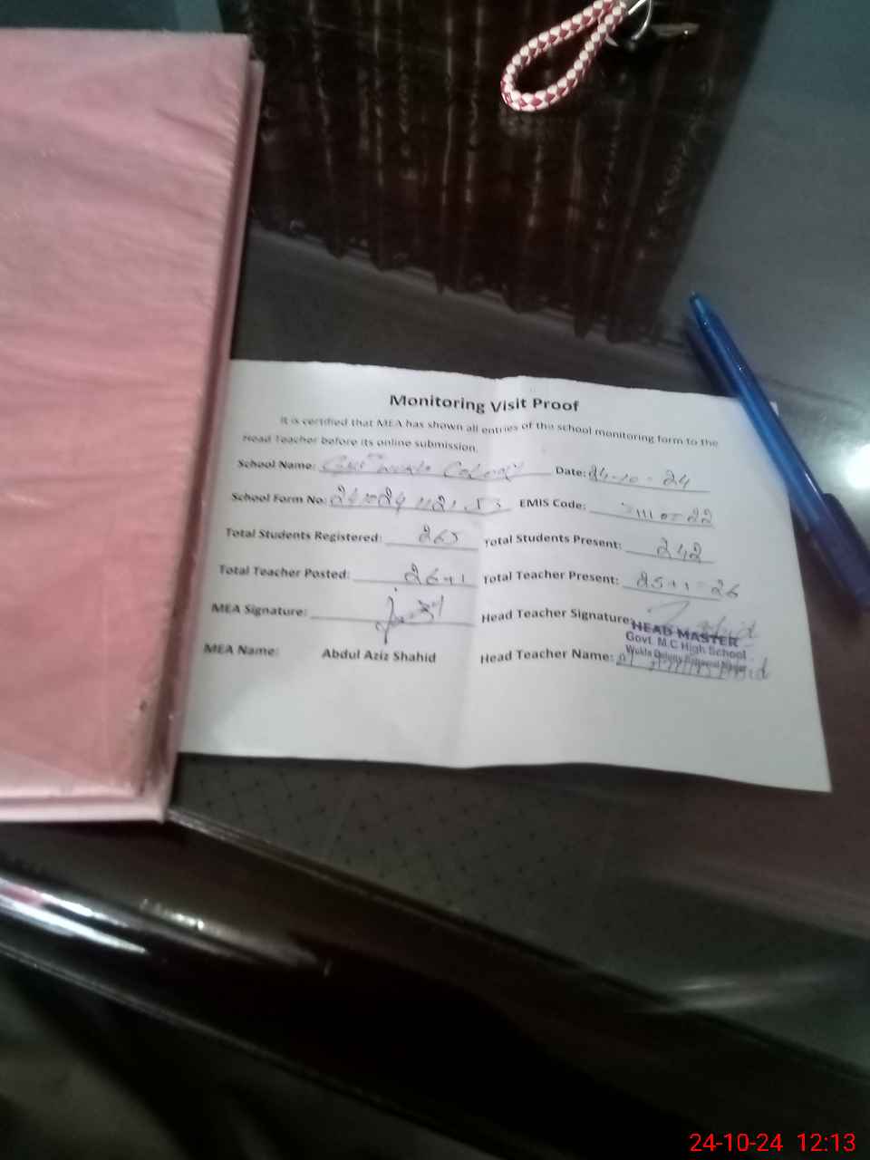 | Attendance Register | Head Teacher | MEA with School | Visit Proof |