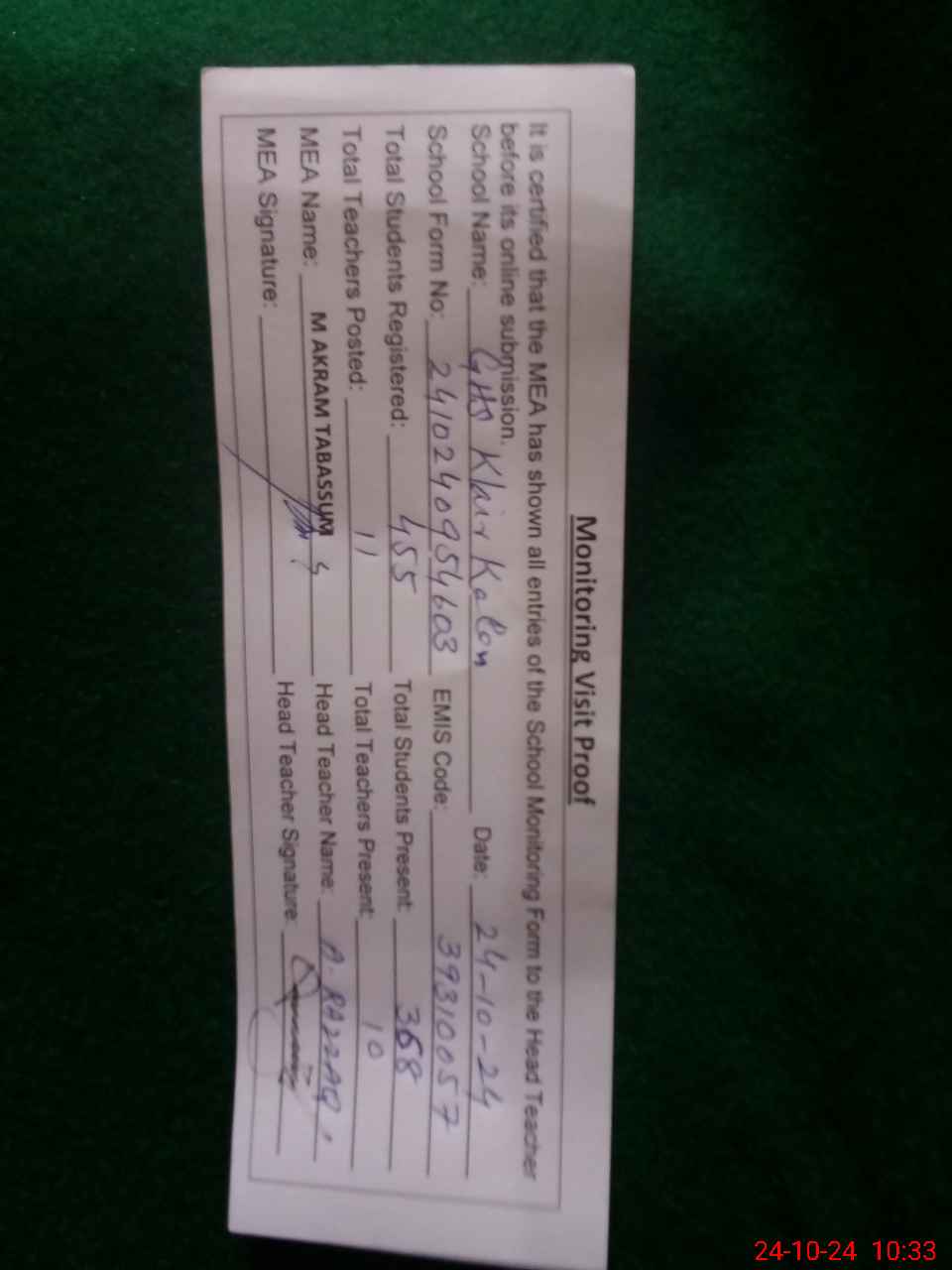 | Certified that this School was Inspected by the Undersigned MEA/DMO Today and the Information Stated Above is as Per Record. | |||||