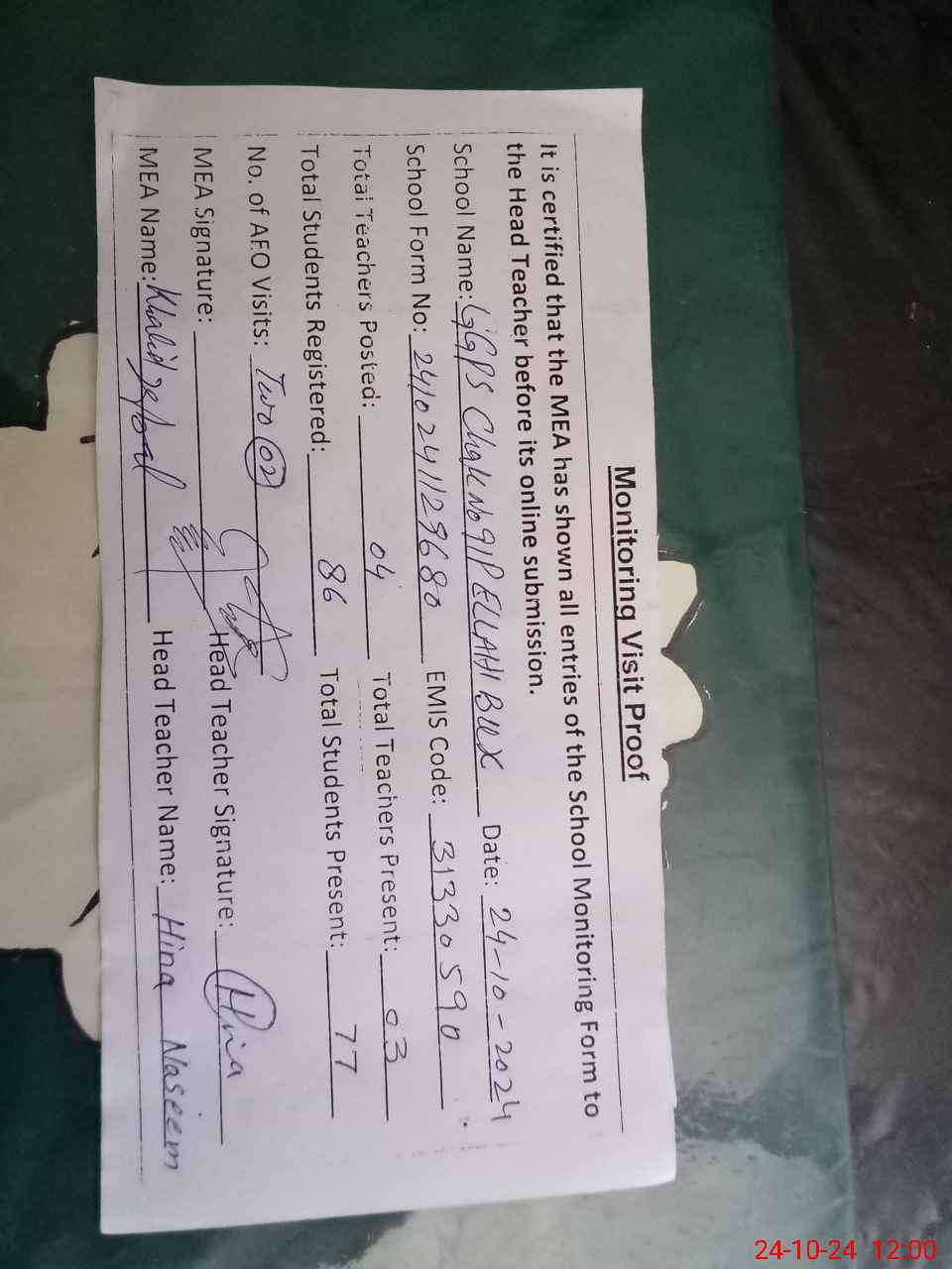 | Remarks (Use Separate Page if Required): Class verification is not updated on mea tab as per sis and two classes are sitting in veranda | |||||