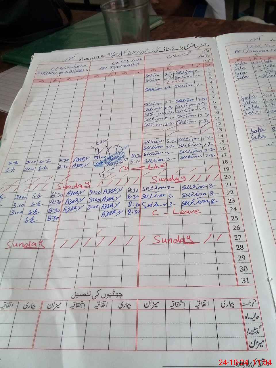 | Leave | Duty | Absent | Maternity | Medical | Ex- Pak |