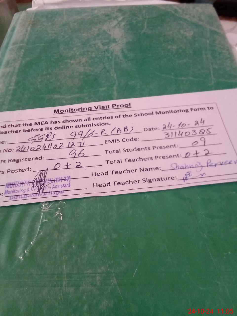 | Attendance Register | Head Teacher | MEA with School | Visit Proof |