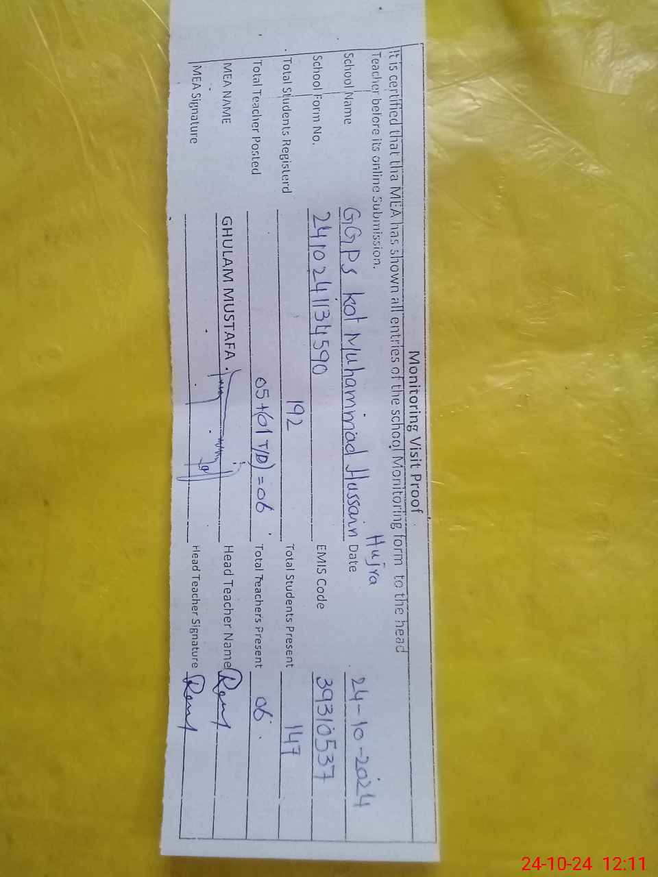 | Attendance Register | Head Teacher | MEA with School | Visit Proof |