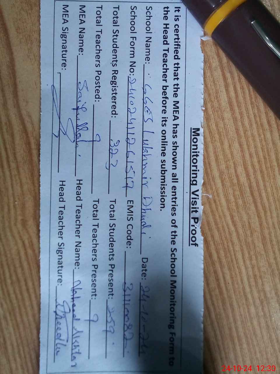 | Attendance Register | Head Teacher | MEA with School | Visit Proof |