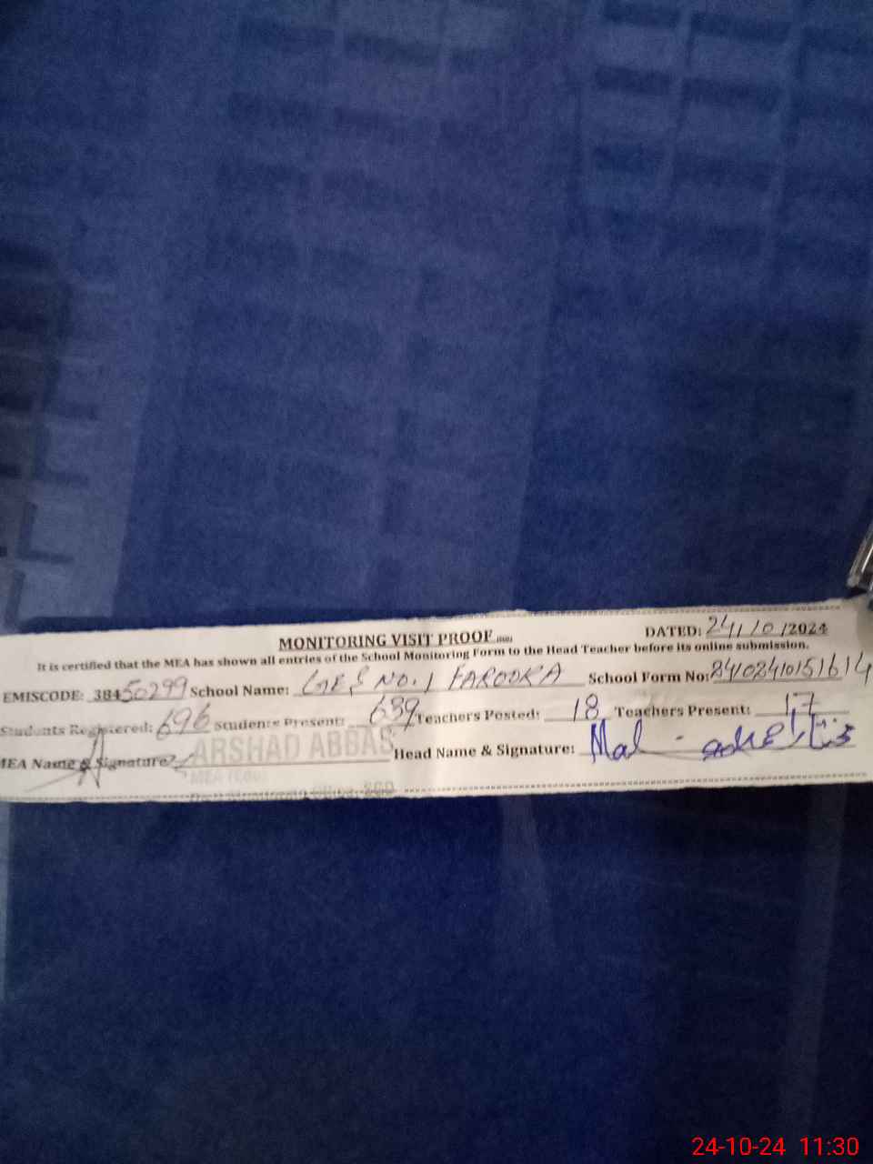 | Certified that this School was Inspected by the Undersigned MEA/DMO Today and the Information Stated Above is as Per Record. | |||||