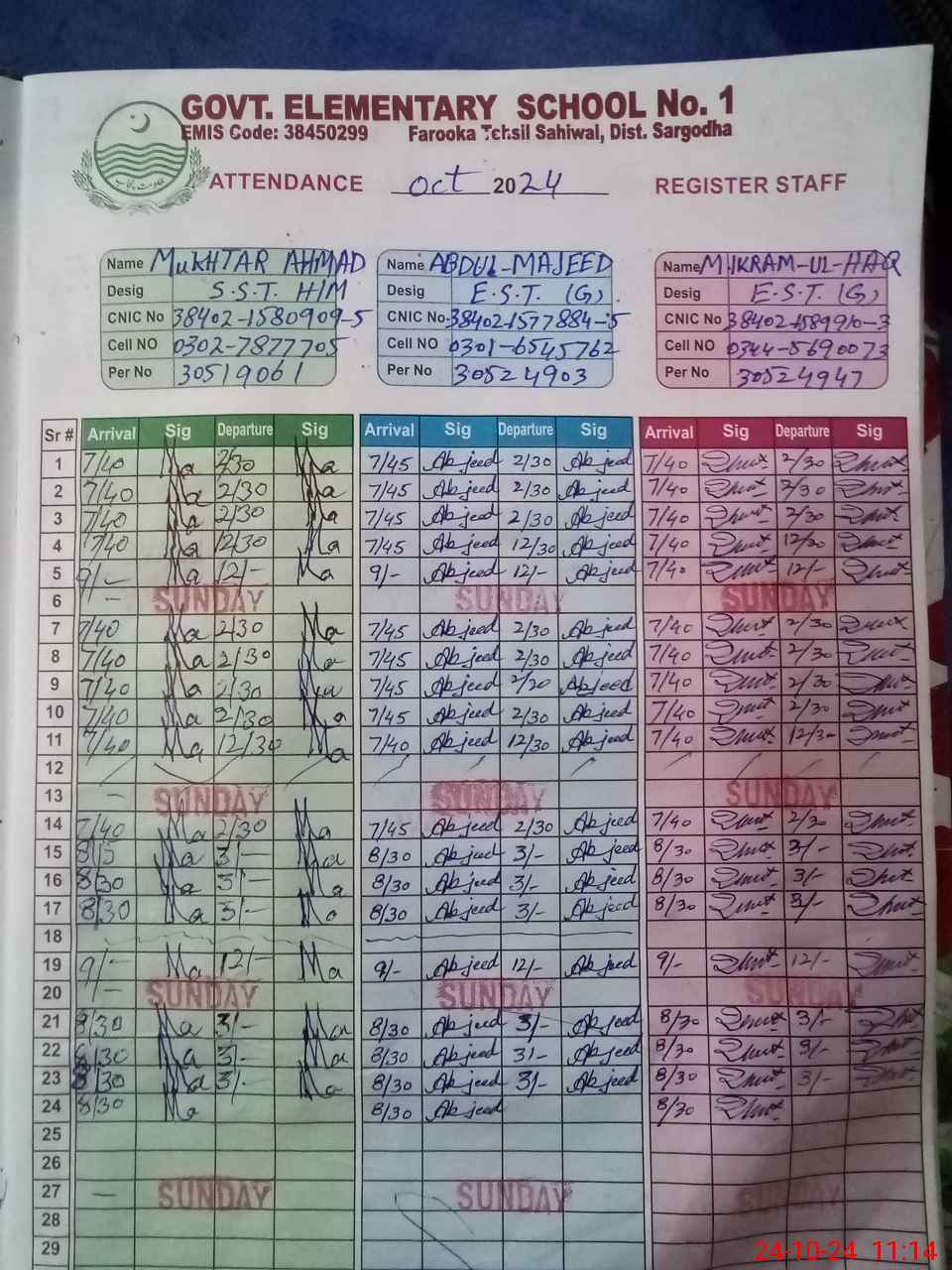 | CNIC | Full Name | Designation | R/C | Absence during last cal. month |