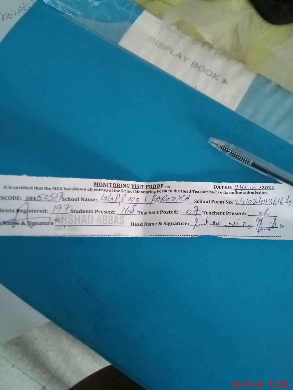 | Certified that this School was Inspected by the Undersigned MEA/DMO Today and the Information Stated Above is as Per Record. | |||||