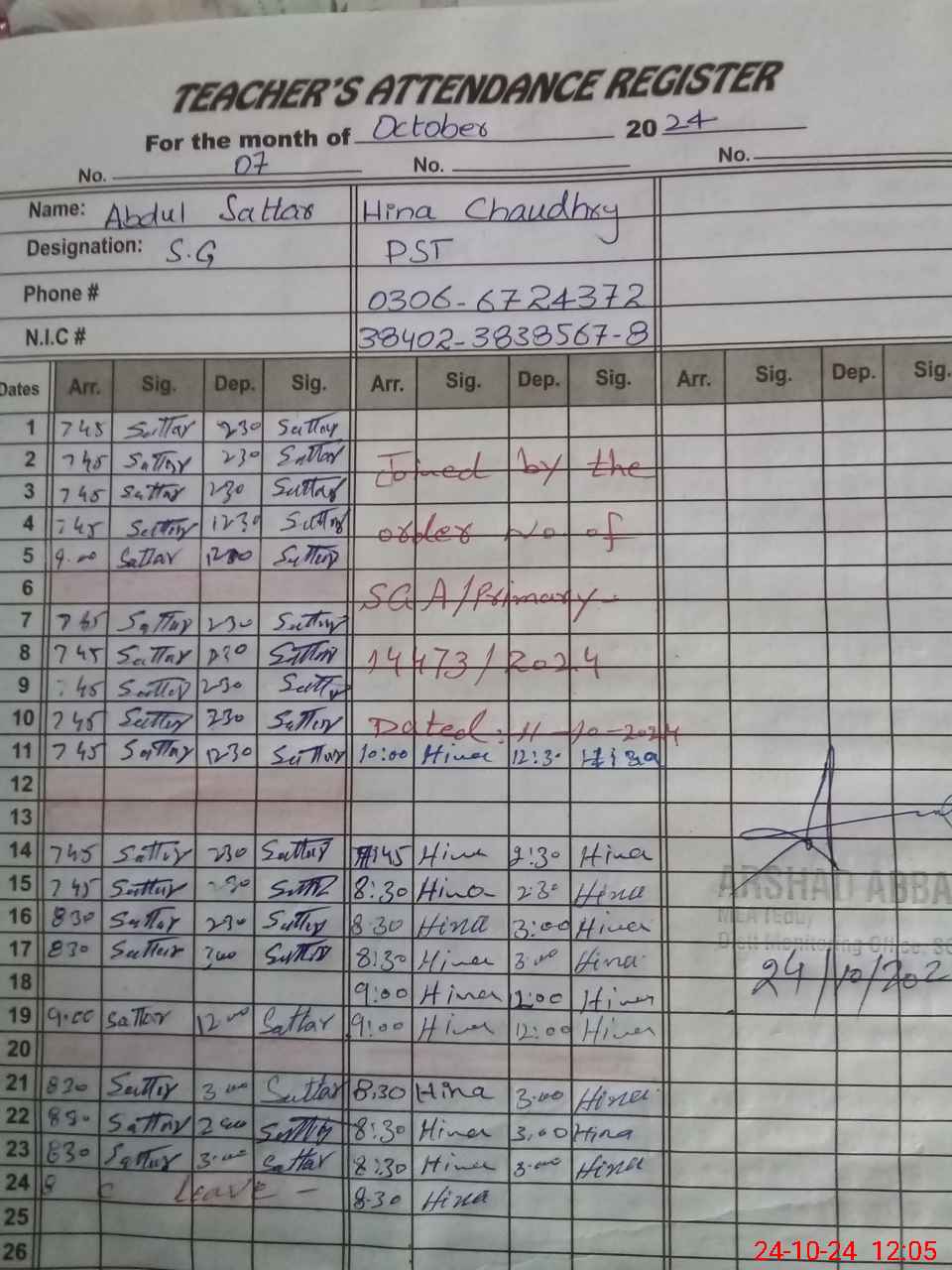 | Name: ZA**** UNNI**** Designation: (School Headmaster's/Headmistress's) PST Phone/Cell Number: 03**** |