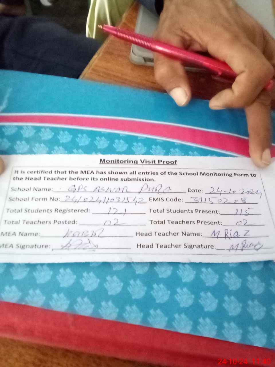 | Attendance Register | Head Teacher | MEA with School | Visit Proof |
